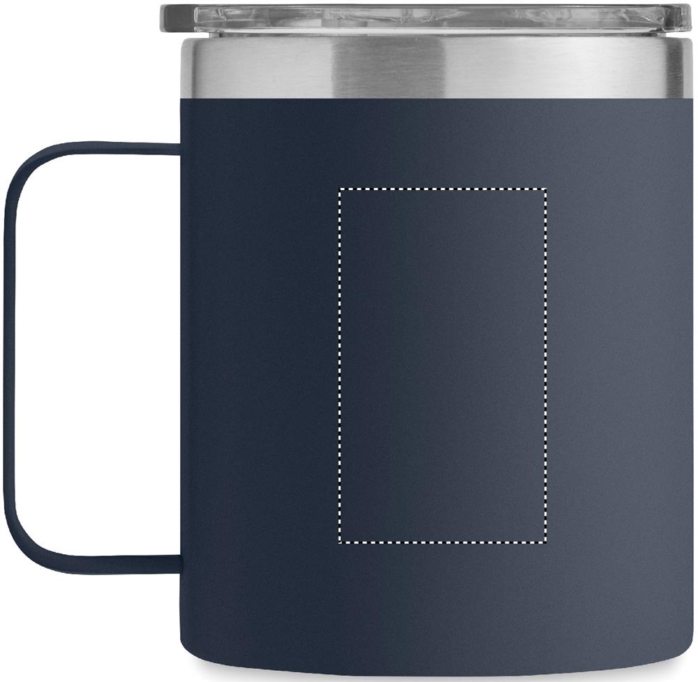 Mugg med dubbelvägg i återvunnet rostfritt stål (90 % återvunnet rostfritt och stål 10 % rostfritt stål) med glidande lock för siphål. Volym: 300 ml.